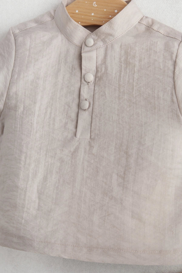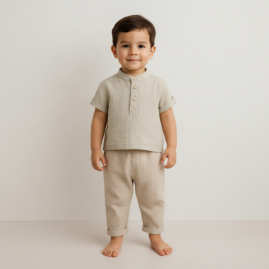 Combining elegance and comfort, the Classic 2-Piece Set is a modern staple for baby boys. Made from a soft blend of cotton and lyocell, this set is breathable, lightweight, and gentle on sensitive skin. With a mandarin-collar shirt and relaxed trousers, it’s a stylish yet practical outfit for both everyday wear and special occasions.